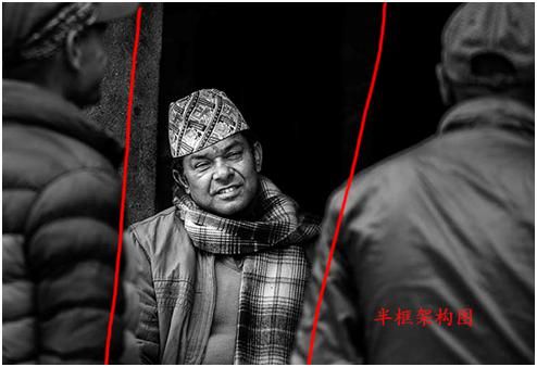 上面這兩張圖第一張,歸類為半包圍。第二張圖也是半包圍,在尼泊爾的一個小鎮拍的,旁邊兩個人是背影,實際上把這個人夾在中間,所以這個人特別容易引起你的注意,形成了一種包圍趨勢,在電影的鏡頭語言中運用的比較多。