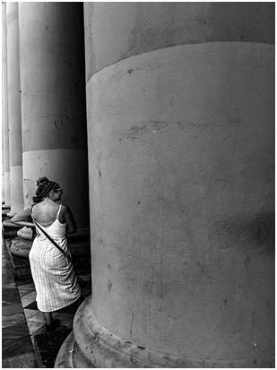 第一張圖也是在街上拍的,女人肯定在與柱子后面的人在交流,是什么樣的人?他們在做什么?其實都留給了觀者,這就屬于開放式構圖。