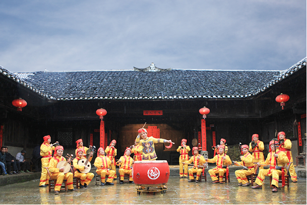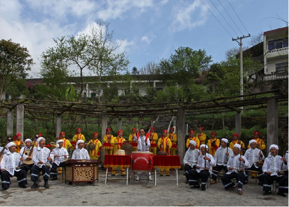 民俗性。建始絲弦鑼鼓產生及發展是以廣泛的民俗活動為載體的。因為獨特的演出形式,其樂隊配置可大可小,小到5人的基本配置,大到幾十人的鑼鼓喧天。既可登大雅之堂,又可進入千家萬戶;既可坐著表演,又可在行進中演出。它既是表演藝術,又可以和紅白喜事渾然一體,成為紅白喜事活動主體不可分割的部分,所以建始絲弦鑼鼓廣泛用于福壽、生子、婚喪、嫁娶、造宅、祝壽、開業慶祝等民間民俗活動,而在不同民俗活動中,又有著不同的使用禮儀和禁忌。