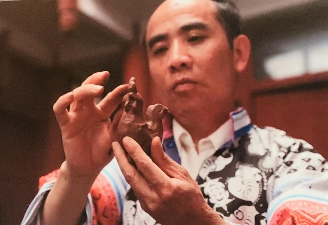 黃平縣舊州鎮(zhèn)泥哨傳承人陳應坤在制作泥哨(許覬佳攝于貴州省博物館)
