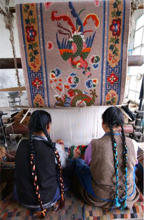 從前,“措巴”每年都要派人去拉薩專為達賴喇嘛和地方政府編織卡墊以及其他羊毛織品。十三世達賴喇嘛土登嘉措時期,江孜織工索朗多布杰手藝高超,曾為達賴喇嘛織了雙龍靠墊、凈水瓶袋等著名織品,被封為五品官。民主改革后,江孜卡墊業在中央政府的關懷下又有了新的發展,他們編織的“布達拉宮”、“珠穆朗瑪”、“萬里長城”等壁毯和地毯,是享譽國內外的精品。