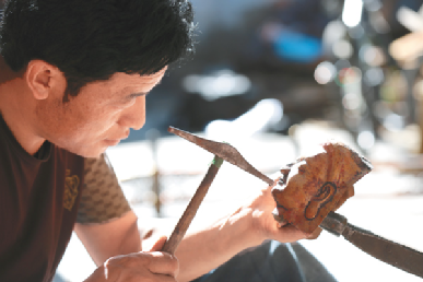 20歲前的次嘎已可以承接一些佛像的鍛敲任務,掌握的技術遠遠超出一起學習的其他學徒們。從鍛敲佛像的蓮花底座、焊接,再到鍛敲銅佛造像上半身、下半身,再到慢慢地開始做些佛像飾物。偶爾,次嘎也能涉獵造像的臉部。這是一個造像師手藝達到最好時才可以觸及的部位。“面部結構復雜又微妙,面部表情的刻畫更是難上加難。作為一個造像師,這是最考驗功力的地方,每一次敲打都在決定作品的成敗。”次嘎說道。