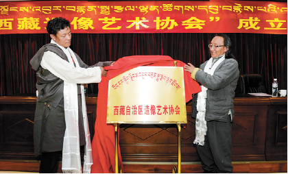 2017年12月3日,西藏造像藝術協會在拉薩成立。 圖為該協會會長朵普·次嘎(左)與西藏民族藝術研究所副所長阿旺丹增共同為協會揭牌。