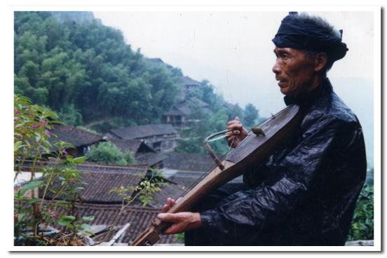 果哈是苗族唯一的古老的民間弓弦樂器,因其形似瓢,故苗語稱之為果哈(意即瓢琴),是唱古歌時不可缺少的伴奏樂器,一般以歌師自拉自唱為主。制作工藝比較粗糙,先選一段長60厘米、直徑為15厘米左右的鴨腳木或泡桐木制成琴身,在其二分之一的一端剜成瓢狀,封住薄板作共鳴箱。另一端修成琴柄,在琴柄頂端鉆孔安琴鈕,用棕繩、牛筋作琴弦,用竹片和綜絲制成弓。琴置兩弦,演奏時以人的唾液代替松香,演奏者時而將弓毛放入口中,讓弓毛增加溫度,增強與琴弦的磨擦,使之發音。果哈音量微弱,發音低沉,但音色獨特,與苗歌語調相當協調,較適合表現安靜、深沉情緒,故常為苗族敘事古歌伴奏。