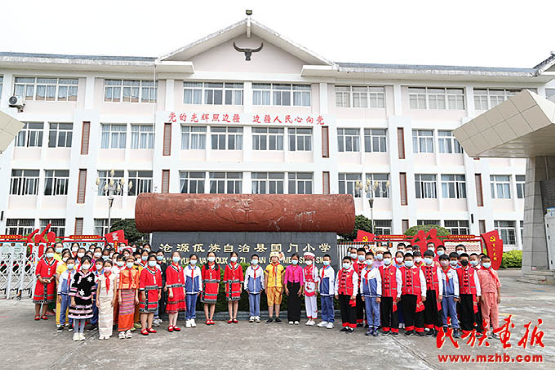 云南省臨滄市滄源佤族自治縣國門小學(xué)是一所位于中緬邊境線上的縣直小學(xué),創(chuàng)辦于1937年2月,曾四易校址,六更校名。學(xué)?,F(xiàn)有38個(gè)教學(xué)班,在校學(xué)生1668人,其中少數(shù)民族學(xué)生1172人。在開展民族團(tuán)結(jié)進(jìn)步教育工作中,滄源佤族自治縣國門小學(xué)以社會(huì)主義核心價(jià)值觀為引領(lǐng),以德育工作為抓手,充分發(fā)揮少先隊(duì)組織的作用,形成了以學(xué)校為龍頭、家庭為基礎(chǔ)、社會(huì)為平臺(tái)的民族團(tuán)結(jié)育人團(tuán)隊(duì)。