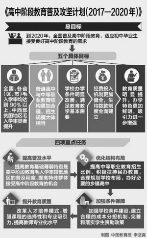 為保障普及目標的實現,《攻堅計劃》提出了4項重點任務:一是提高普及水平。重點是提高教育基礎薄弱特別是高中階段教育毛入學率較低地區的普及程度,提高特殊群體接受高中階段教育的機會,解決有學上的問題。二是優化結構布局。重點是提高中等職業教育招生比例,積極扶持民辦教育,合理規劃學校布局,辦好必要的鄉鎮高中,為學生提供更多選擇機會和就學便利。三是加強條件保障。重點是加強學校條件建設,建立合理的成本分擔機制,完善和落實學生資助政策,為高中階段教育發展構建長效保障機制。四是提升教育質量。重點是改革人才培養模式,增強課程的選擇性和專業吸引力,提高教師專業化水平,實現有質量的普及。