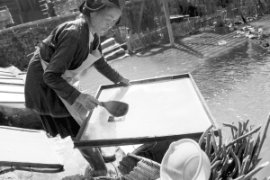 占里村共有182戶827人,這里的侗族古法造紙術源遠流長,全村從事造紙業的就有170戶,占總戶數的93%。這里的造紙業依然保留著原始的家庭作坊和世代傳承的手工制作方式。這種古法造紙技藝以構樹皮為原材料,添加獼猴桃藤、野棉花根,經過水浸泡、石灰腌制、蒸煮、碓爛、攤曬、燒堿漂白、打漿、瀝水、抄紙、烤干等72道工序,最終制成白皮紙。