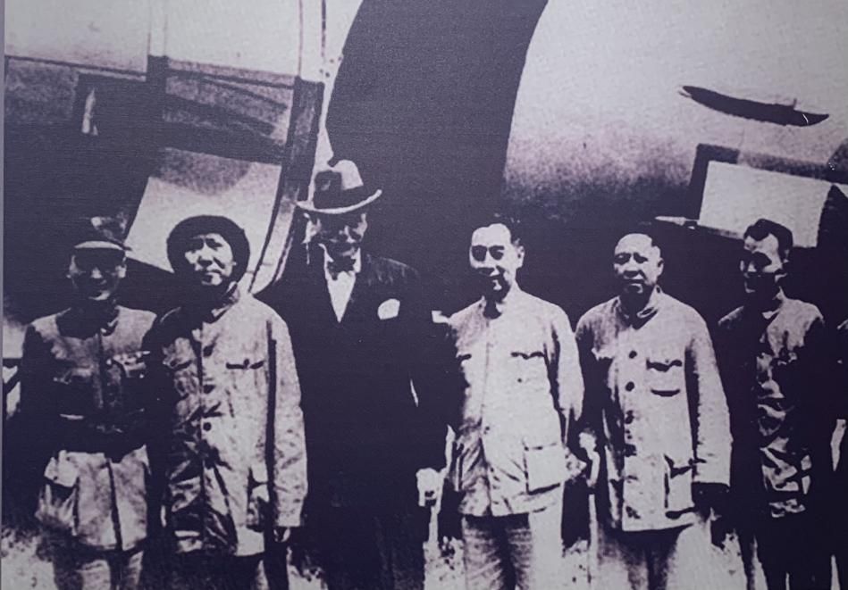 1945年,中共代表團在赫爾利(美國駐中國大使)、張治中的陪同下臨行前在延安機場合影,左起為張治中、毛澤東、赫爾利、周恩來、王若飛、胡喬木。(許覬佳攝于貴陽市達德學校舊址)