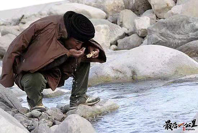 在巡邏間歇,拉齊尼·巴依卡喝著河水,吃著大馕,經常如此。(網絡圖片)