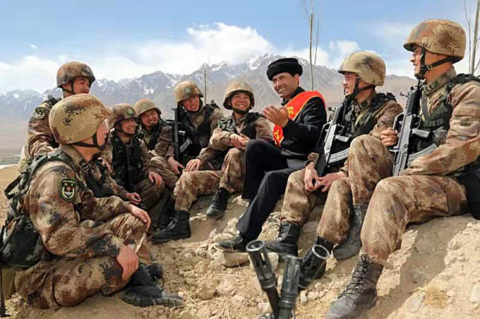 拉齊尼·巴依卡給邊防戰士講戍邊故事。(張慶良 攝影)