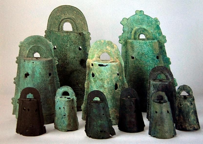 彌生時代也是機織布技術傳播,金屬器的使用和制造開始的時代。銅鐸,是日本本土生產的一種器型,為祈愿豐收時祭祀用的鳴鐘,常見于貴族墓葬中。使用的時候僅敲擊單獨一件,與中國成組配套使用的編鐘不同。