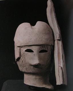 埴輪,為日本特有的器物。埴輪放置在古墳封土表面,即為前方后圓墳中“方”的地方。埴輪分為筒形埴輪,來源于陶器;還有形象埴輪,細分為器物和人物。埴輪來源于中國古代墓室中陪葬的陶俑,或古代帝陵神道上的石獸石人。某些埴輪人物有文面,并填墨(圖十六),推測當時的日本出現了文面現象。