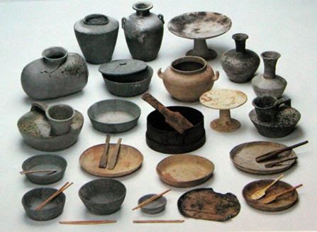 彌生時代的名稱,源自1884年東京市本鄉彌生町“彌生陶器”的發現。彌生陶器與繩紋陶器截然不同,為素面,灰色。日本人認為彌生陶器是“渡來人”制造的。“渡來人”是中國大陸通過朝鮮半島而來,他們帶來了陶器的制作技術。彌生陶器為深釜器,以甕形器、缽形器、高腳杯(豆形器)為主(圖五)。
