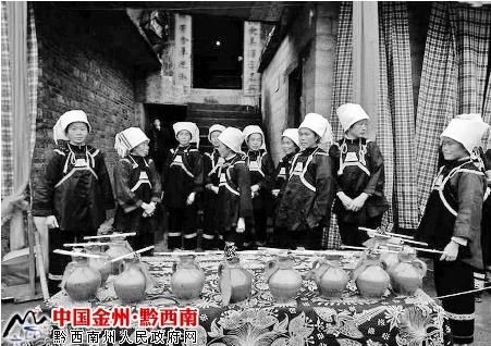 ——禮俗歌。內容豐富多彩,節日或喜慶之日,主客于席上互相吟唱,以抒情懷。以席局《酒歌》為例。可分《問酒歌》、《謝酒歌》、《敬酒歌》等。這些歌,無一不表現出布依族的謙遜、熱情、直爽、好客的美德。禮俗歌還包括敬老人歌、贊媳婦歌、進寨歌、出寨歌、宵夜歌等。這些歌無不反映出布依族尊老愛幼的傳統美德。特別值得一提的是布依族青年男女經過“浪哨“擇愛后,《問媒歌》、《問八字歌》、《說親歌》、《打親家歌》等就詳盡記述了成親過程,很有研究價值。接下來還有《接親歌》、《送親歌》、《擺酒歌》等描述主客的喜悅心情和結親的歡樂氣氛。