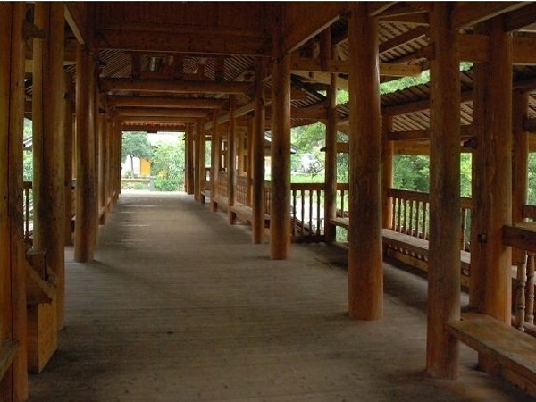 瑤族風(fēng)雨橋,基本上都是跨河而建,主要由三部分組成:分別是下部的墩臺(tái),中部的跨河游廊,上部的廊亭和閣樓。底層的石作與主體木作搭配結(jié)合。從風(fēng)雨橋本身功能來說,廊橋頂面的舍瓦屋面,有利于排水。通透而寬敞的廊橋,適合采光、通風(fēng)和遮雨。同時(shí),石作橋墩?qǐng)?jiān)固耐用,以鄉(xiāng)土水杉作為橋身主材,在群山環(huán)繞、濕熱多雨的亞熱帶氣候中,能夠屹立400余年,至今依然保持其使用功能。