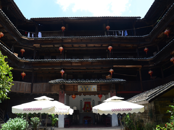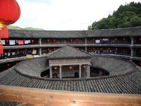 一座土樓就是一個藝術殿堂。每一座土樓,又如同一個“大家族,小社會”。土樓內,居住在同一屋頂下的幾十戶幾百人同祖同宗同血緣同家族,過著共門戶、共廳堂、共樓梯、共庭院、共水井的和睦生活。這種聚族同樓而居的生活模式,典型地反映了客家人的傳統家族倫理和家族的親和力。而且,樓內的客家人,住著層數相同、開間面積相等、無明顯朝向差別、更無貴賤等級之分的均等居室。平等聚居,反映了客家人融洽和睦的家風和平等團結的傳統。