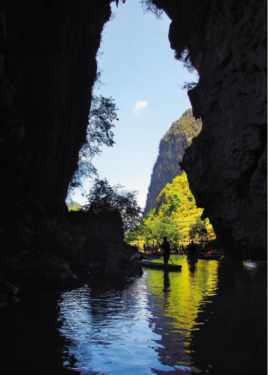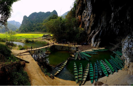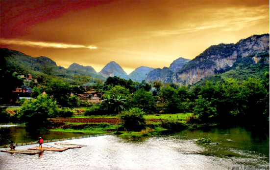 壩美,為壯語譯漢語為:壩—沖口,美—樹 ,因居住的沖口樹木多而得名。壩美村位于珠江流域西江水系馱娘江上游的阿科河畔。屬喀斯特地貌,區域內山峰奇特,河谷幽美,阡陌縱橫,河流山泉蜿蜒奔流,溶洞層疊散布在山體峰內,冬無嚴寒,夏不酷暑,氣候宜人。因四面環山,不通公路,進出寨子主要靠村前村后兩個天然的石灰溶巖水洞,村民們要摸著巖壁趟水、撐竹筏、劃獨木舟、坐小船,經過950米長的幽暗的“出水洞”和680米長的“湯拿洞”才能進出。由于地處偏僻,交通不便,基本不與外界交往,多年來壩美村長時期與外世隔絕。壩美村水源豐富,氣候溫和,自然生態環境未被污染,負氧離子質數高出城市數倍,游人在此休憩,心曠神怡,是一個溫濕潤,四季宜人的旅游勝地。就生態環境和歷史淵源來說,《桃花源記》問世1500多年,只聞其名,不見其實。相傳除唐代確認湖南省桃源縣的桃源洞為其原型外,目前全國就有冠名“世外桃源”的地名16個之多。而今天的壩美,不僅十分相似,而且還神似東晉文學家陶淵明筆下所描寫的“林盡水源,便得一山。山有小口,仿佛若有光;便舍船從口入……土地平曠,屋舍儼然,有良田美池桑竹之屬;阡陌交通,雞犬相聞……”的世外桃源。而且在當地村民中有許多歷史傳說:北宋皇祐四年(公元1052年),壯族起義領袖儂智高在邕州(南寧)昆侖關被狄青打敗后,退入以其繼父儂夏卿為首領的特磨道(廣南)后,至和二年(1055年),宋朝廷又派楊文廣領兵進剿,儂智高在突出重圍轉至阿科(今廣南縣壩美鎮治所)與宋軍周旋,終因寡不敵眾而離開阿科轉戰于丘北、開遠、蒙自、元江等地,后到大理不知所終。