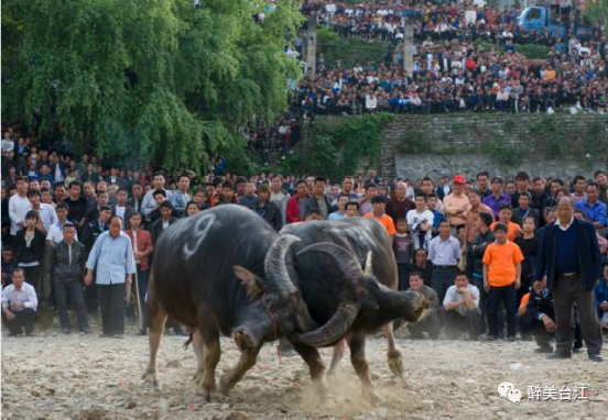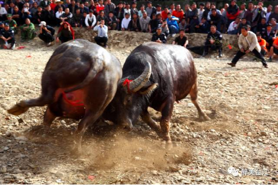 ▲ 斗牛之牛,都是專門精心飼養的,不從事耕地、拉車、推磨等勞作,均為雄性水牛,分為寬角、窄角兩個級別。斗牛賽制,先為淘汰賽,決斗時改為單循環賽,最后勝出者為年度牛王。斗牛場面十分慘烈,動人心魄,觀眾少則數百,多則數萬。
