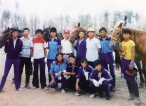 1986年,西藏有了自己專業(yè)的馬術(shù)隊(duì)(后排左四為現(xiàn)任西藏競(jìng)技馬術(shù)隊(duì)領(lǐng)隊(duì)措東,站立者右二為現(xiàn)任西藏競(jìng)技馬術(shù)隊(duì)教練單增)。