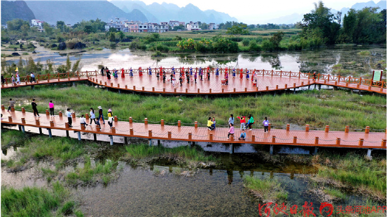都安各族群眾在澄江國家濕地公園表演打扁擔。