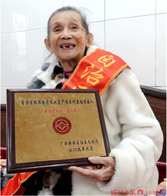 今年已經88歲高齡的“壯族打扁擔”技藝傳承人唐小琴,她從小即耳濡目染,跟村里老人、長者學習打扁擔,后因打扁擔需要指揮,又學習皮鼓打法。1961年4月,唐小琴從學校調入縣文化館任文化藝術輔導員,挖掘整理了《壯族打扁擔》《板凳舞》《斑鳩舞》等一大批傳統舞蹈,并多次在自治區、河池地區的比賽、調演上獲獎。1986年退休后,仍然致力于《壯族打扁擔》的傳承工作,2004年,組建都安縣老干康樂藝術團,帶動安陽鎮退休老人學習打扁擔技藝。2009年,她被確認為自治區非物質文物遺產項目“壯族打扁擔”代表性傳承人。