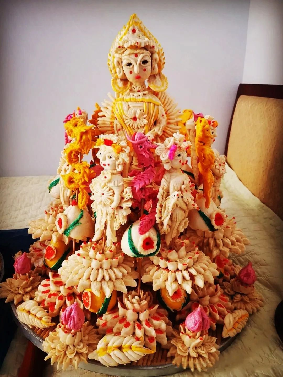 面塑,俗稱捏面人。在呼和浩特市托克托縣地區最早就用面粉為主料,用手和簡單的工具捏出各種造型的面制品,然后上籠蒸熟,常用來祭祀、供奉先人、送人和人生儀禮。托克托縣地區面塑制品主要有面人、棗山山、寒燕燕、面鎖等。