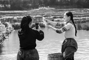 云南紅河哈尼稻作梯田系統被認定為全球重要農業文化遺產。圖為當地村民在梯田旁直播抓魚。 陳欣波攝