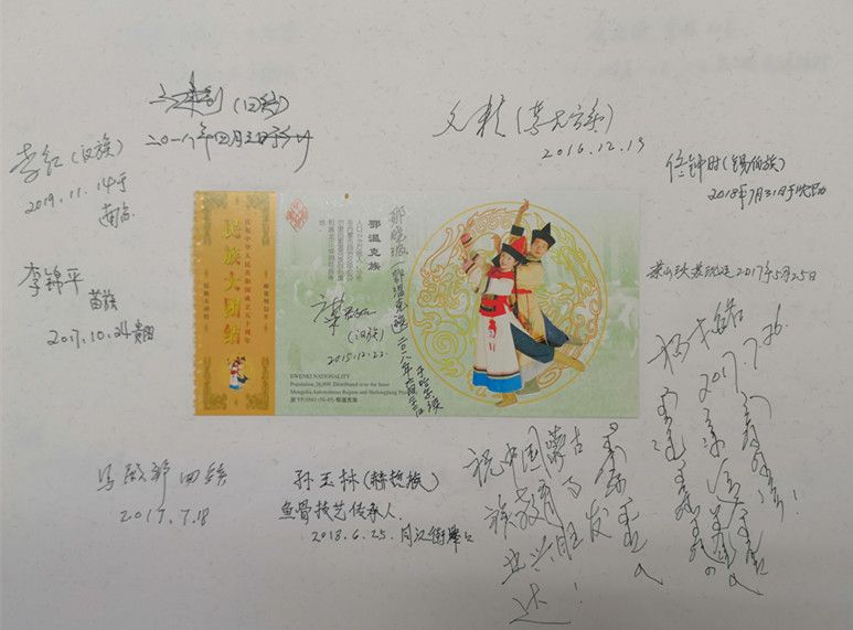 在采集口述影像錄音資料的同時(shí),項(xiàng)目組還收集了大量的珍貴歷史照片以及相關(guān)文物。值得一提的是,他們?cè)O(shè)計(jì)了一種非常有特色的受訪者簽名簿,中間貼著繪有56個(gè)民族的音樂(lè)舞蹈圖案的首日封或明信片,四周簽上受訪者的人名簽名字、民族特征,有些還用民族文字書(shū)寫(xiě),體現(xiàn)了中華各民族團(tuán)結(jié)在一起的精神風(fēng)貌。簽名簿有厚厚的幾大本,設(shè)計(jì)精美,承載著民族工作口述史資源采集的經(jīng)歷,具有豐富的文化內(nèi)涵和博物館收藏價(jià)值。