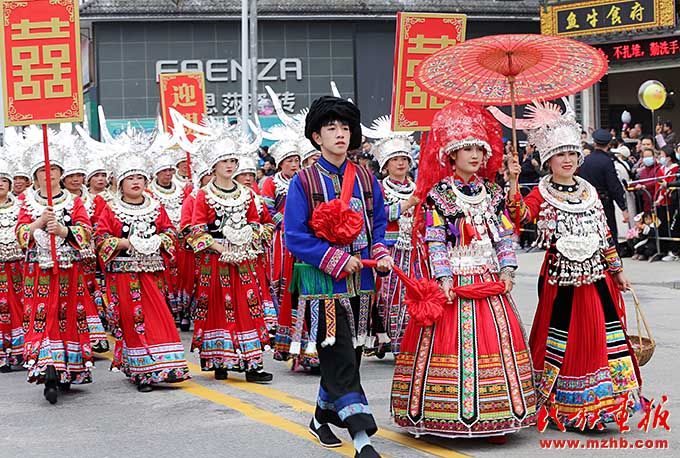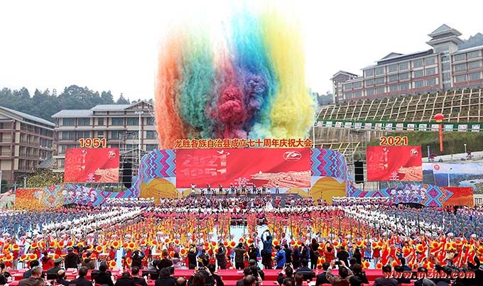 各民族同胞身著盛裝、歡聚一堂,通過民族風情展示、龍獅展演、文藝表演、跳民族團結舞等活動歡慶縣慶,展示了龍勝民族團結進步事業全新風貌與經濟社會發展成果,各族人民脫貧致富的幸福感,以及各民族親如一家、共同團結奮斗、共同繁榮發展的新氣象。