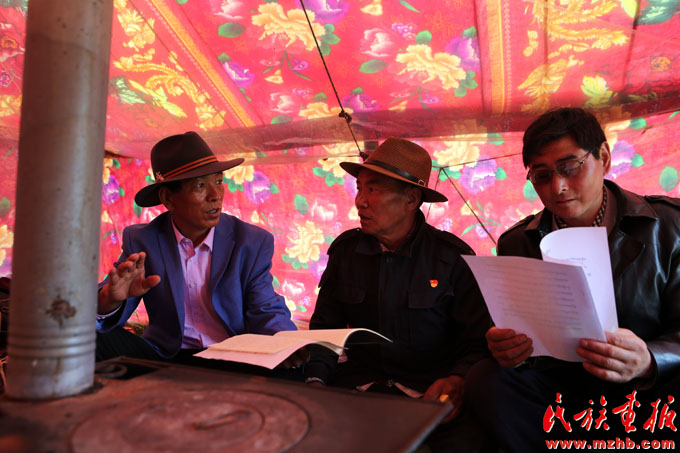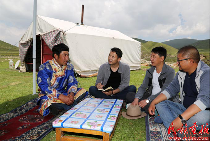 土旦(左)入戶向牧民宣傳草原法律法規和國家相關草原保護政策(黃若天 攝影)