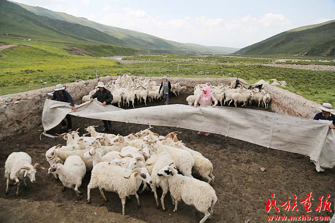 為響應退牧還草政策,海晏縣哈勒景村的蒙古族牧民改變過去逐水草而居的生活,通過禁牧、以草定畜等措施改變草原生態。海云一家將羊群驅趕到一起為羊接種疫苗(陳濤 攝影)