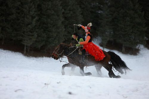 在傳統的竟技比賽場上,最激動人心的還是“姑娘追”它往往是全場比賽的壓軸戲?!肮媚镒贰?據說是由上古“追姑娘”的風習演變而來,至今既是哈薩克人最喜愛的娛樂項目,又是小伙子找對象談情說愛的好機會。