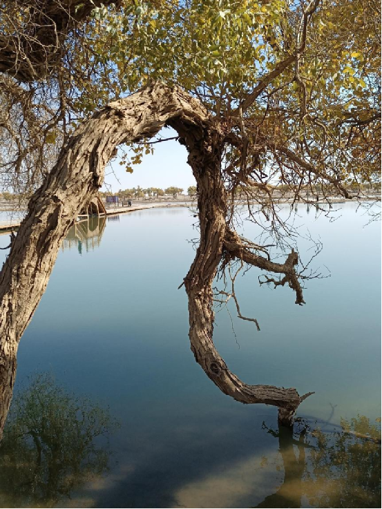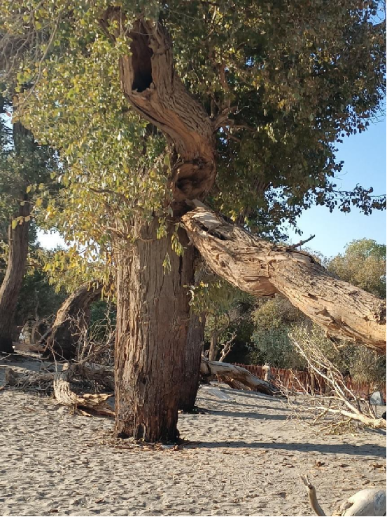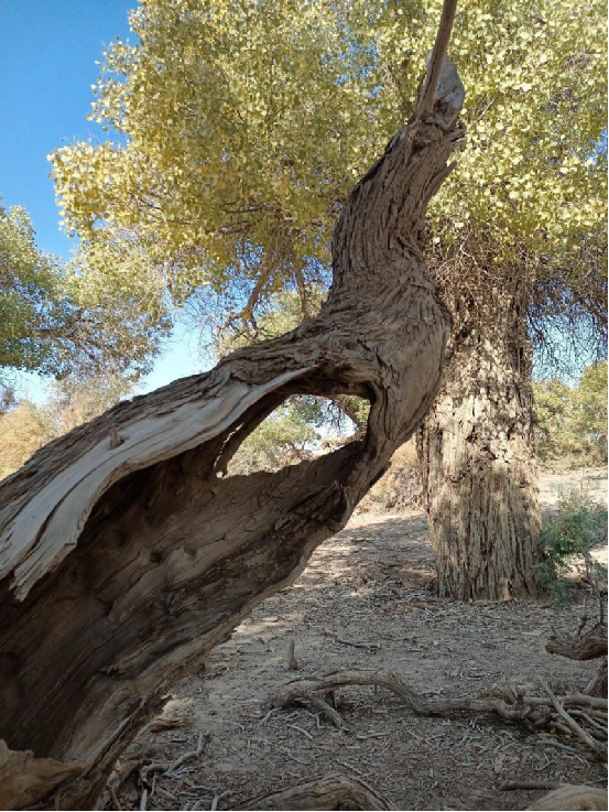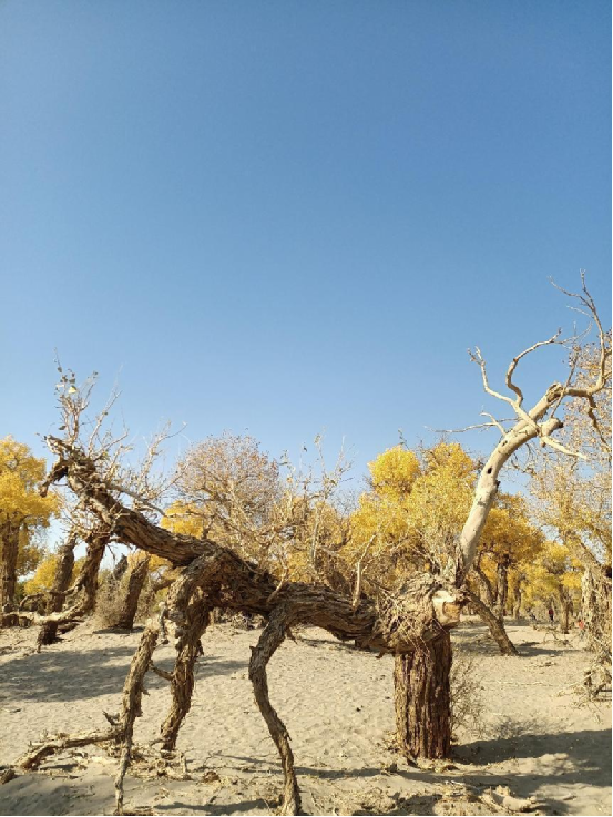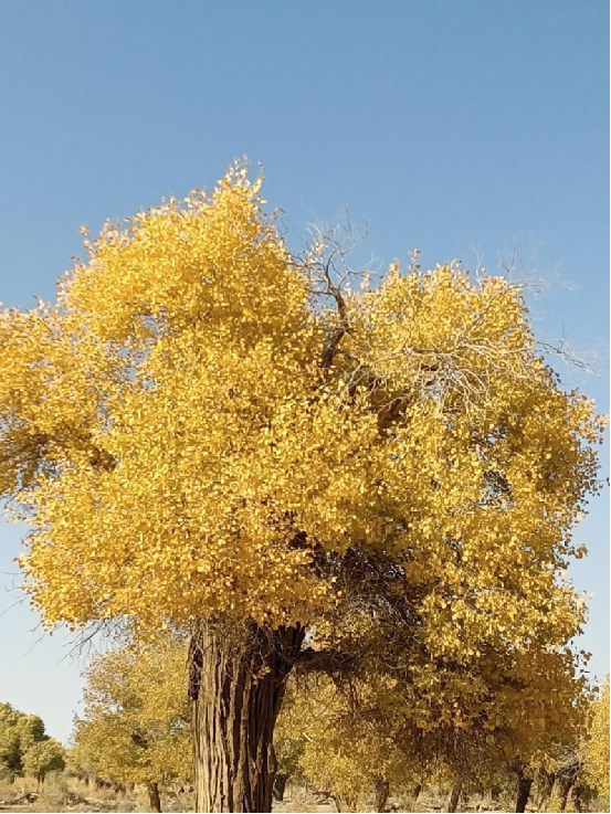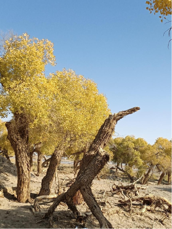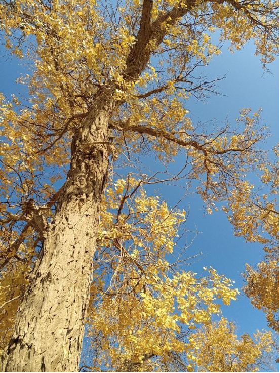 每當深秋季節,胡楊樹葉變得一片金黃,形成胡楊秋色,樹影婆娑,奇妙絕倫,賞心悅目。漫步在濃郁的胡楊林中仿佛進入神話般的仙境。茂密的胡楊千奇百怪,神態萬般。粗壯的幾人難以合抱,挺拔的七、八丈之高,怪異的似蒼龍騰越,似虬蟠狂舞,令人驚奇不已,嘆為觀止。僅就密密匝匝的樹葉,也是風采獨有。幼小的胡楊,葉片狹長而細小,宛若少女嫵媚的柳眉,人們常常把它誤認為柳樹;壯齡的胡楊,葉片又變成卵形、闊卵形或三角形,猶如興安嶺的白樺;進入老年期的胡楊,葉片才定型為橢圓形。更令人稱奇者,在同一棵胡楊樹冠的上下層次,還長著不同形狀的葉片,因此,又稱“異葉楊”