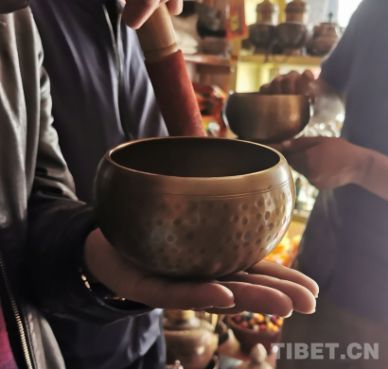 有兩位商人告訴我,所謂的sing bowl是一種“神秘”的銅制品。當最初看到這種“神秘”的東西時,我有些懷疑他們所謂的“神秘”性。因為從外觀上看,sing bowl就是一種大些的銅碗。但是,當商家自信地演示,我見證了所謂的“神秘”??偨Y(jié)起來,主要有三個方面:第一,這種銅碗確實會“唱歌”,只需用一個小小的木棒沿著碗的邊緣旋轉(zhuǎn),“歌聲”就會由小到大。但其中有兩個要點,一是要緩緩地旋轉(zhuǎn),不可以太快;二是要順時針旋轉(zhuǎn)。第二,發(fā)出“嗡嗡”的“歌聲”的同時,從托著碗的手掌處會產(chǎn)生一種震動,商家說,在尼泊爾和印度,這種震動被認為對內(nèi)臟的健康極有好處,所以有治療五臟六腑病患的功效。第三,一般以左手托碗,右手持木棒沿碗的邊緣旋轉(zhuǎn)。