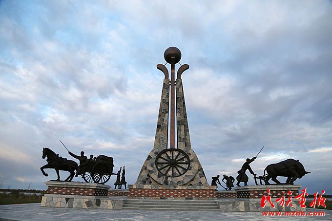 黑河市愛輝區坤河達斡爾族滿族鄉富拉爾基達斡爾族南遷廣場上的雕塑反映了達斡爾族在黑龍江畔開墾土地,建設家園的情景。