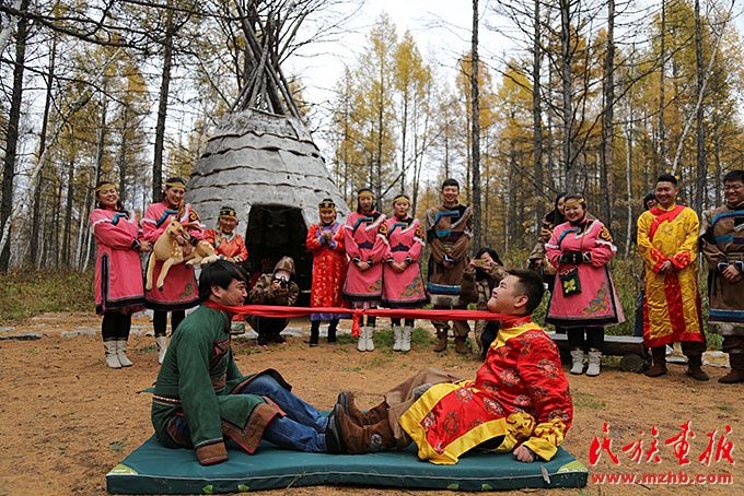 鄂倫春族傳統民俗文化帶動了鄉村旅游發展。圖為鄂倫春族傳統婚俗表演。