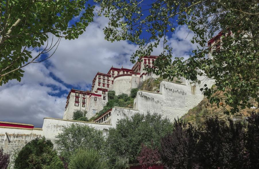 宮宇疊砌,迂回曲折,同山體有機地融合,這是布達拉宮給人最為直接的感受。其外觀有13層,自山腳向上,直至山頂。整體建筑主要由東部的白宮,中部的紅宮及西部白色的僧房組成。