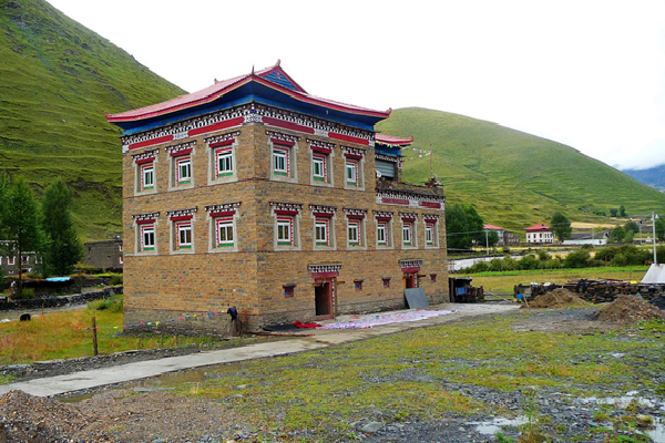 “碉院”則是一組較大的綜合性建筑,一般三層,局部四層,平面為四全院式,中間有較大的天井內(nèi)院,設(shè)小花壇,可種樹木花卉。內(nèi)院四周設(shè)回廊,石砌外墻用全封閉,除了門洞,墻上開少量小窗。底層為牲畜圈、雜用房;二層多為倉庫、接待房、傭工房等;三層為臥室、廚房和糧倉、珍寶庫;四層為經(jīng)堂、佛堂、經(jīng)書庫。有的在外墻女兒墻部分刷以黑色或棕色圓珠圖案,窗上檐一層或二層方椽挑出,作為傳統(tǒng)式藏窗形式,豐富了立面,改變了石墻面之笨拙感。