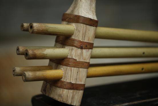 共鳴管:是套在笙管上端的一截竹管,可使音量明顯增大,多使用毛竹制作,依音高不同而異,以c、c1、c2三音為例,管長(zhǎng)分別為60厘米、30厘米、15厘米,余者類推。以上所述為黔東南地區(qū)的苗族蘆笙;在黔中、黔南和黔西北,則流行著另一種形制的蘆笙,笙管用白竹或筍殼竹制作,下端管口不堵塞。上端用兩道竹篾箍緊,笙斗制作時(shí)中間不剖開,而是從粗端挖起,直通細(xì)端吹口部位,然后用圓木塞把粗端開口堵嚴(yán),再用數(shù)道化篙皮箍住。
