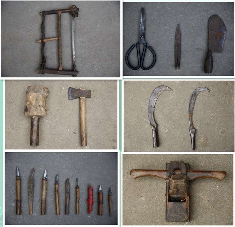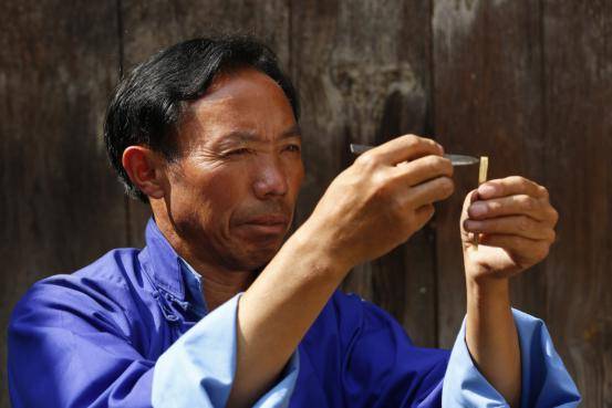 制作蘆笙大的工序有12道,再細(xì)一點(diǎn)有幾十項(xiàng)。如第一道是到山上去選竹子,拿尺子慢慢比劃,三拳的有多長(zhǎng),要很細(xì)心地選,確實(shí)可以用。取下來之后,第二道工序是拿到河邊去洗,用紗布搓。因?yàn)橹窆苡泻芏喟唿c(diǎn),關(guān)節(jié)處有很多毛,要很細(xì)致的把那些東西全搓掉。弄好之后用太陽曬,曬干曬白。第三道工序,就是取杉樹的木頭做笙斗,計(jì)劃好做三拳的是多少公分,四拳是多少公分。十二道工序,后面越學(xué)越復(fù)雜,每一道工序都很講究。